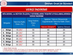 - Vergi İndirimi: Gelir veya kurumlar vergisinin, yatırım için öngörülen katkı tutarına ulaşıncaya kadar, indirimli olarak uygulanmasıdır.