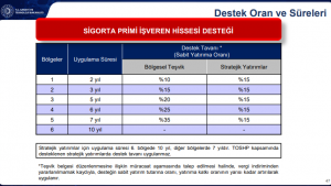 - Sigorta Primi İşveren Hissesi Desteği: Teşvik belgesi kapsamı yatırımla sağlanan ilave istihdam için ödenmesi gereken sigorta primi işveren hissesinin asgari ücrete tekabül eden kısmının Bakanlıkça karşılanmasıdır. Teşvik belgesi düzenlenmesine ilişkin müracaat aşamasında talep edilmesi halinde vergi indiriminden yararlanılmamak kaydıyla sigorta primi işveren hissesi desteği oranları vergi indirimine ilişkin yatırıma katkı oranlarının yarısı kadar artırılarak uygulanır.