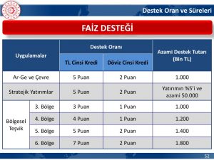 - Faiz veya Kar Payı Desteği: Faiz veya kar payı desteği, teşvik belgesi kapsamında kullanılan en az bir yıl vadeli yatırım kredileri için sağlanan bir finansman desteği olup, teşvik belgesinde kayıtlı sabit yatırım tutarının %70’ine kadar kullanılan krediye ilişkin ödenecek faizin veya kâr payının belli bir kısmının Bakanlıkça karşılanmasıdır.
